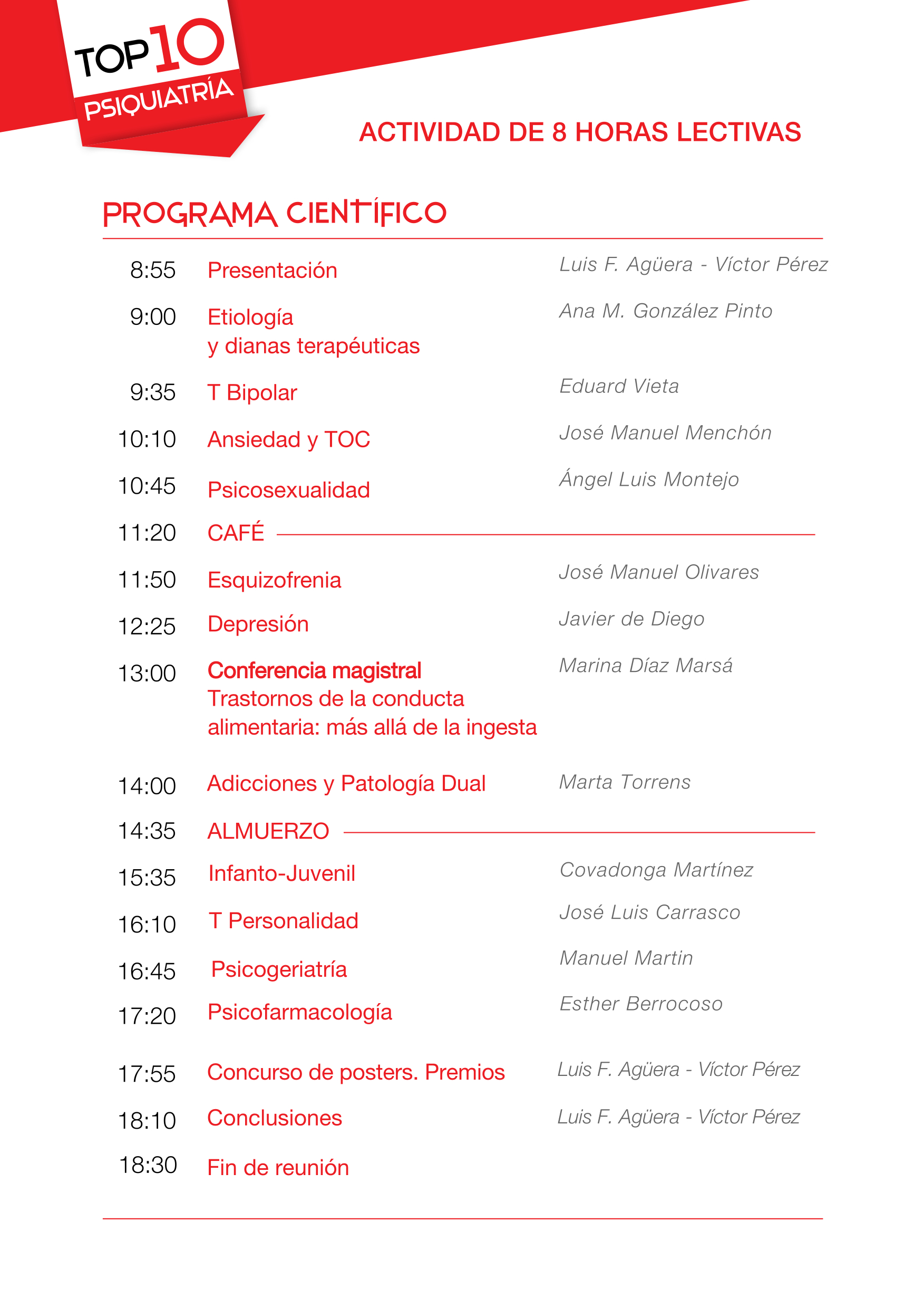 Se trata de una nueva ocasión de asistir a una puesta al día de los últimos avances producidos en las áreas más relevantes de la Psiquiatría, seleccionados y comentados por psiquiatras de reconocido prestigio, máximos expertos en cada área, con amplia experiencia docente e investigadora. Los ponentes revisan la información disponible y seleccionan las 10 noticias más importantes de su área en el último año. Todos ellos también trabajan con pacientes y explican la aplicación de las novedades a la práctica clínica.